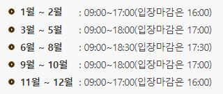 경복궁의 관람시간은 09:00 ~17:00이며 계절별로 연장 운영하니 자세한 관람시간은 아래 표를 참고하세요! 매주 화요일은 휴무일이며, 단 화요일이 공휴일일 경우 개방하니, 자세한 문의는 전화 (02) 3700-3900으로 하시면 됩니다!
