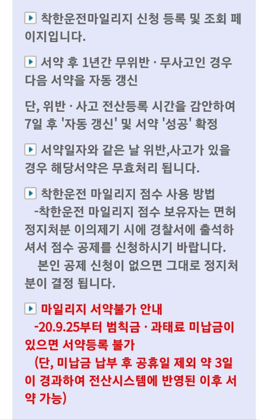 착한운전마일리지 서약 버튼을 누르고 1년간 무위반, 무사고인 경우 다음 서약은 자동갱신되니 서약은 한 번만 하면 됩니다.