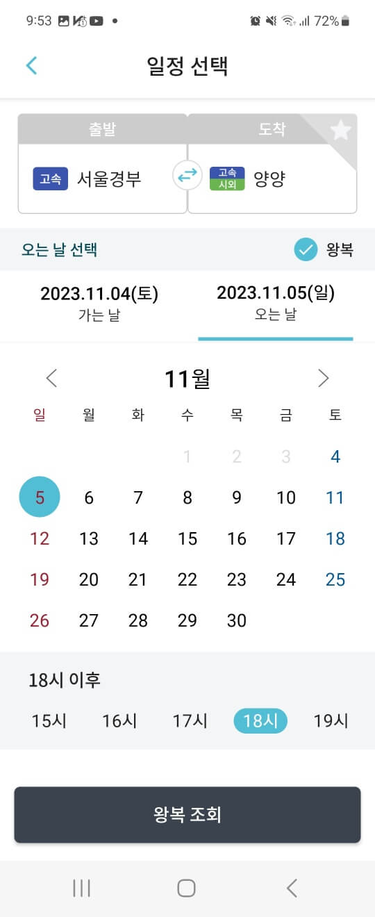 저는 11월 5일에 서울 경부 고속터미널에서 양양으로 가는 버스를 조회했습니다.