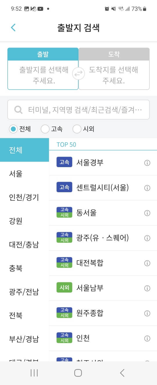 그다음 출발지와 도착지 터미널을 선택합니다.