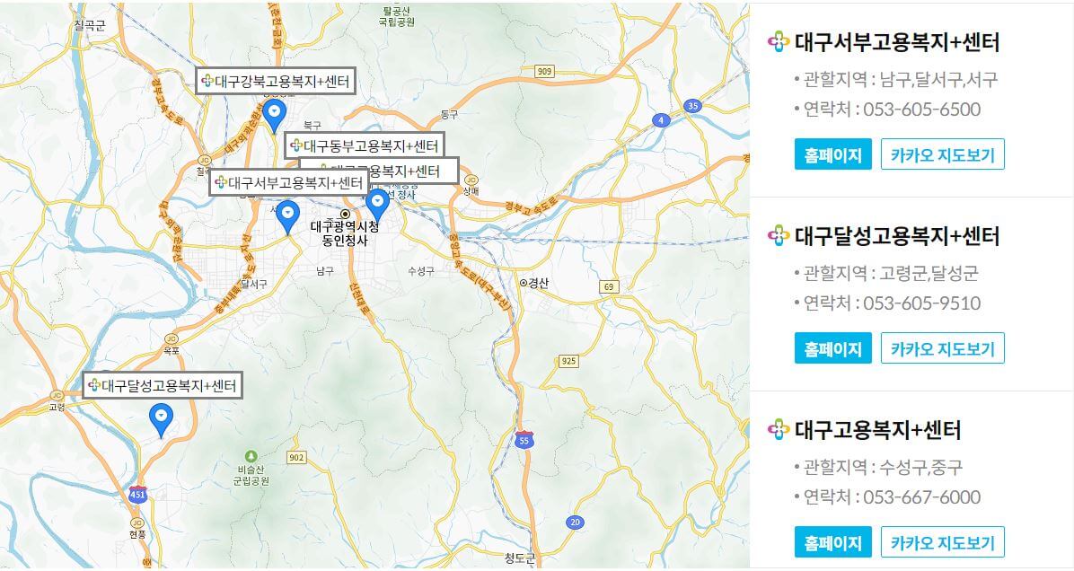 저는 대구로 검색해 보았습니다. 대구시의 6개 고용복지플러스센터의 위치와 홈페이지 및 연락처가 바로 나옵니다!