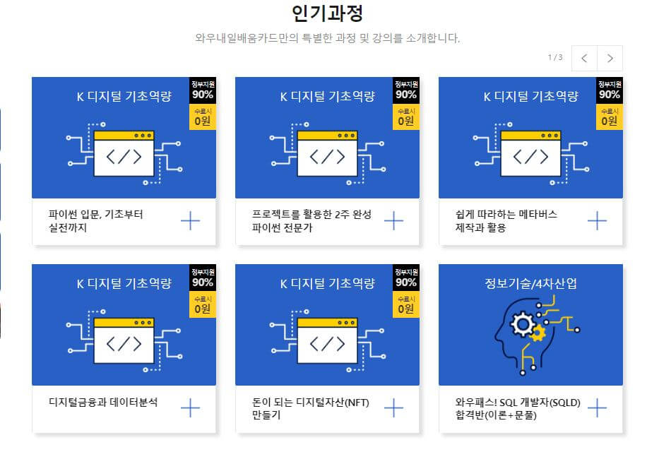 또한, 근로자 원격훈련기관인 와우 내일 배움 카드 (와내카) 사이트에서는 요즘 인기 있는 디지털 전문 과정들을 수강할 수 있습니다.