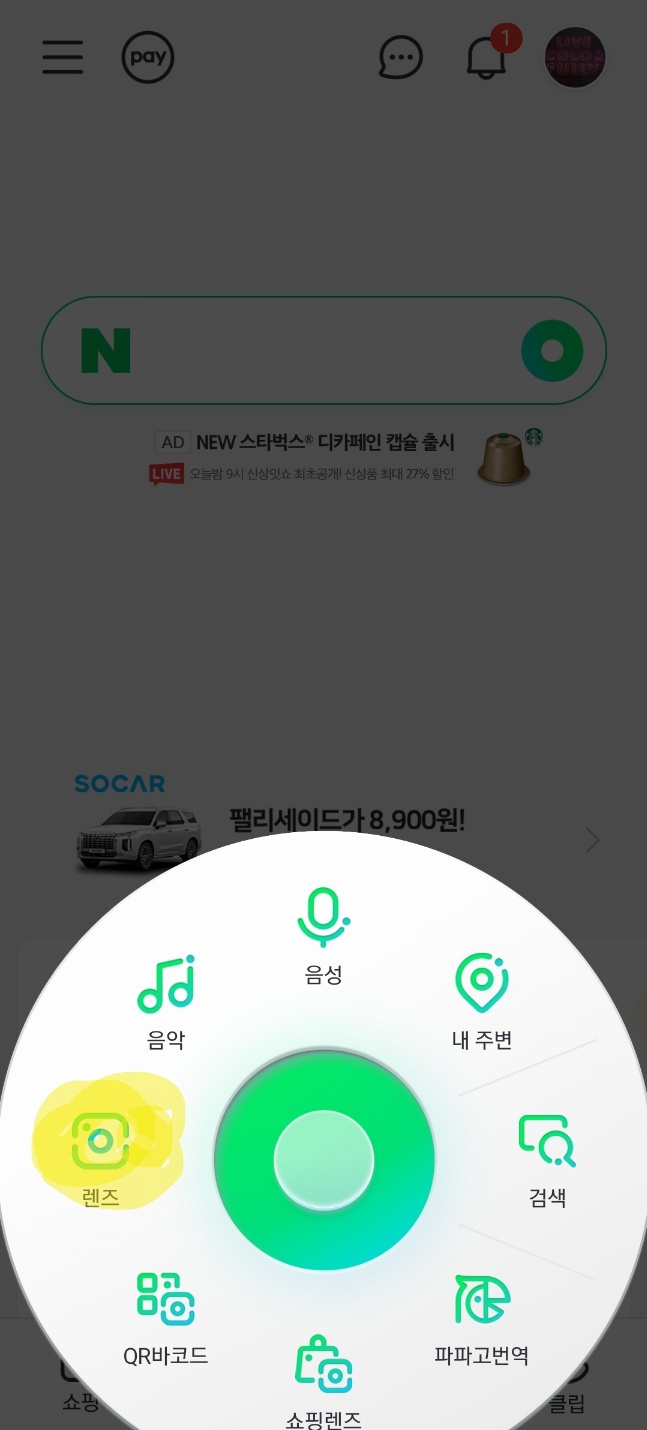 그다음 네이버 앱을 열고 검색창의 그린닷 버튼을 누릅니다.