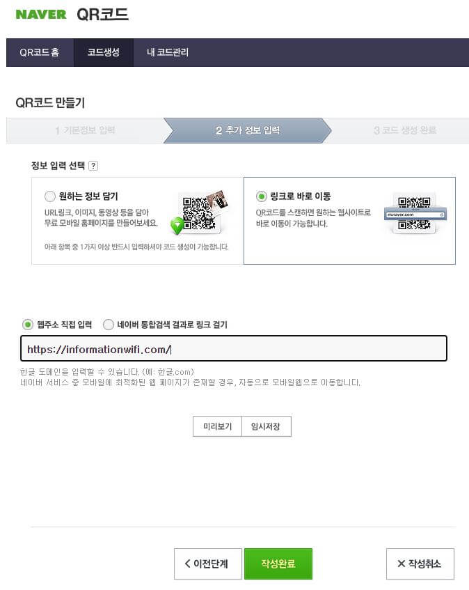 2. 추가 정보 입력에서는 "링크로 바로 이동"을 선택 후 웹 주소를 직접 입력합니다. 저는 예시로 저의 블로그 주소를 입력했습니다. 그다음 "작성 완료" 버튼을 누르면 끝! QR 코드가 생성되었습니다.