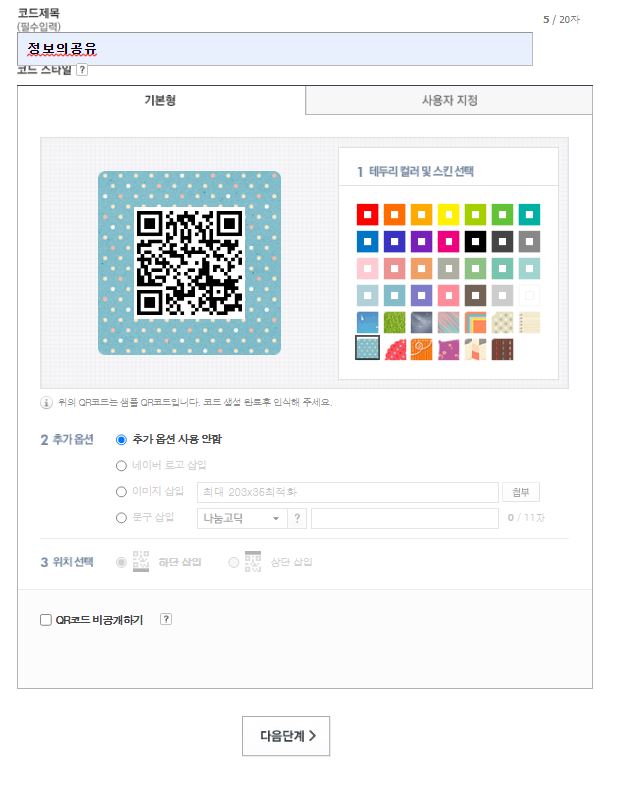 로그인 후 1. 기본정보입력 화면에서, 먼저 코드 제목을 입력합니다. 저는 예시로 저의 블로그 이름인 "정보의 공유"를 입력하였습니다.