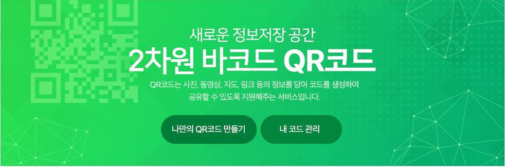새로운 정보저장 공안 2차원 바코드 QR코드 QR코드는 사진, 동영상, 지도, 링크 등의 정보를 담아 코드를 생성하여 공유할 수 있도록 지원해주는 서비스입니다. 나만의 QR코드 만들기 내 코드 관리