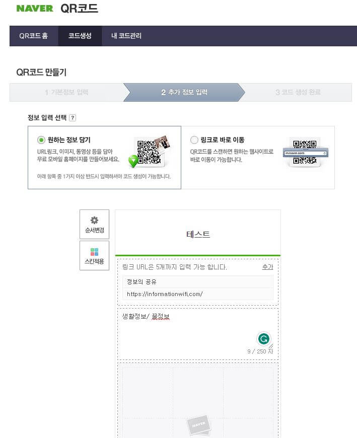 여기까지가 1분 완성법이었고요, 좀 더 자세하게 원하는 정보를 담고 싶을 때는 2. 추가 정보 입력 단계에서 "원하는 정보 담기" 를 선택합니다.