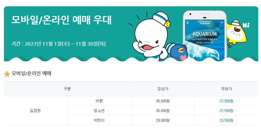 롯데타워 아쿠아리움의 할인은 제휴카드 할인과 통신사 할인을 받는 방법이 할인율이 가장 큽니다. 월별로 할인 행사를 진행하므로 행사 기간이 지나도 비슷한 할인율로 할인 행사가 계속되니 꼭 확인 후 혜택을 놓치지 마세요!