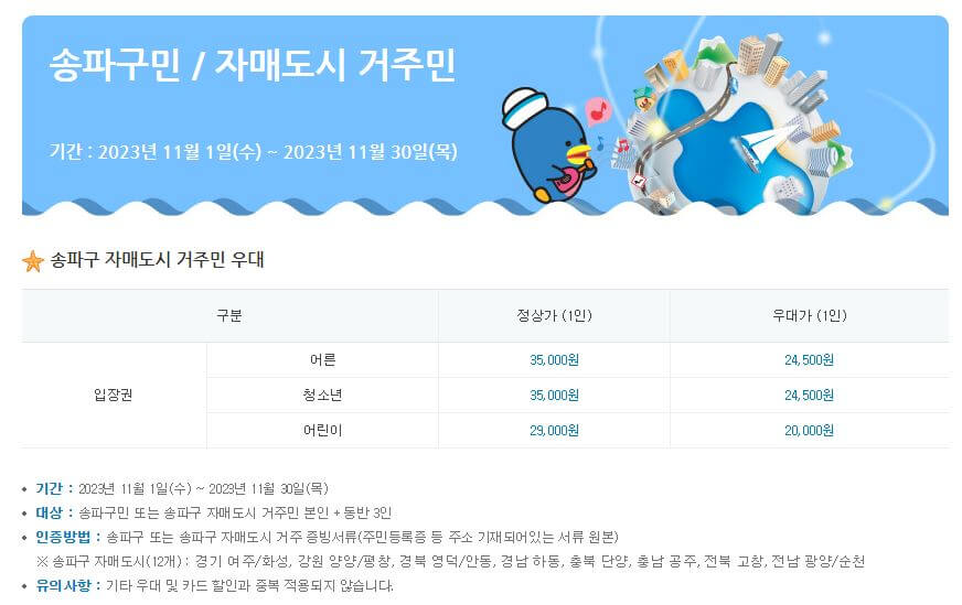 송파구민 및 송파구 자매도시의 거주민은 30% 할인을 해주니 꼭 주민등록증이나 주소 증빙 서류를 지참하세요.
