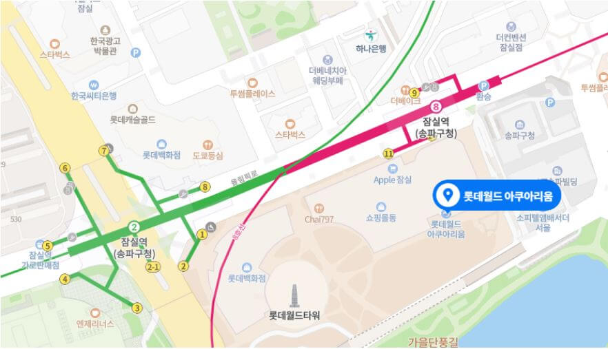 롯데타워 아쿠아리움의 주차는 8호선 잠실역 11번 출구 앞 지하주차장 입구로 진입하여 롯데월드몰 (롯데콘서트홀) 주차장에 주차하시면 됩니다.