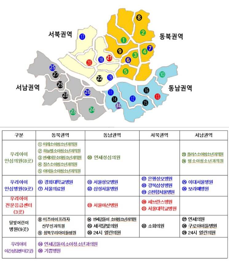 서울시에서는 서울형 야간, 휴일 소아의료체계를 구축하여, 시도 때도 없이 갑자기 아픈 우리 아이들을 바로 진료할 수 있도록 우리 아이 안심의원, 우리 아이 안심병원, 달빛어린이 병원을 서울시 권역별로 24시간 운영하고 있습니다. 아래 그림을 참고하시고 다운로드하여 이용하세요!