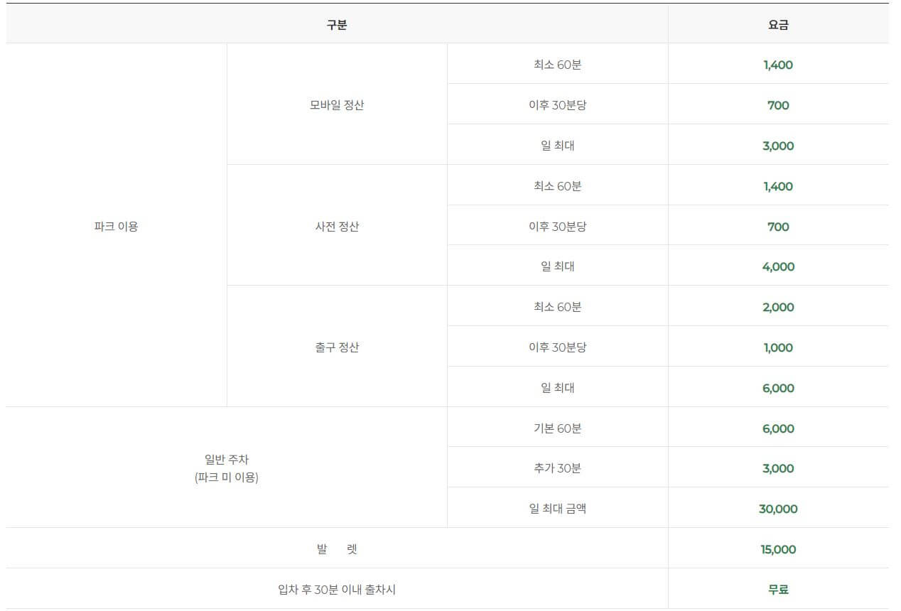 부산 롯데월드 어드벤처의 주차장은 유료로 운영되고 있습니다. 최초 1시간 1400원이며 일 최대 3,000원입니다. 단 이것도 모바일정산 및 사전 정산 시에 적용되니 꼭 아래 모바일 앱을 다운로드하여서 이용하세요.