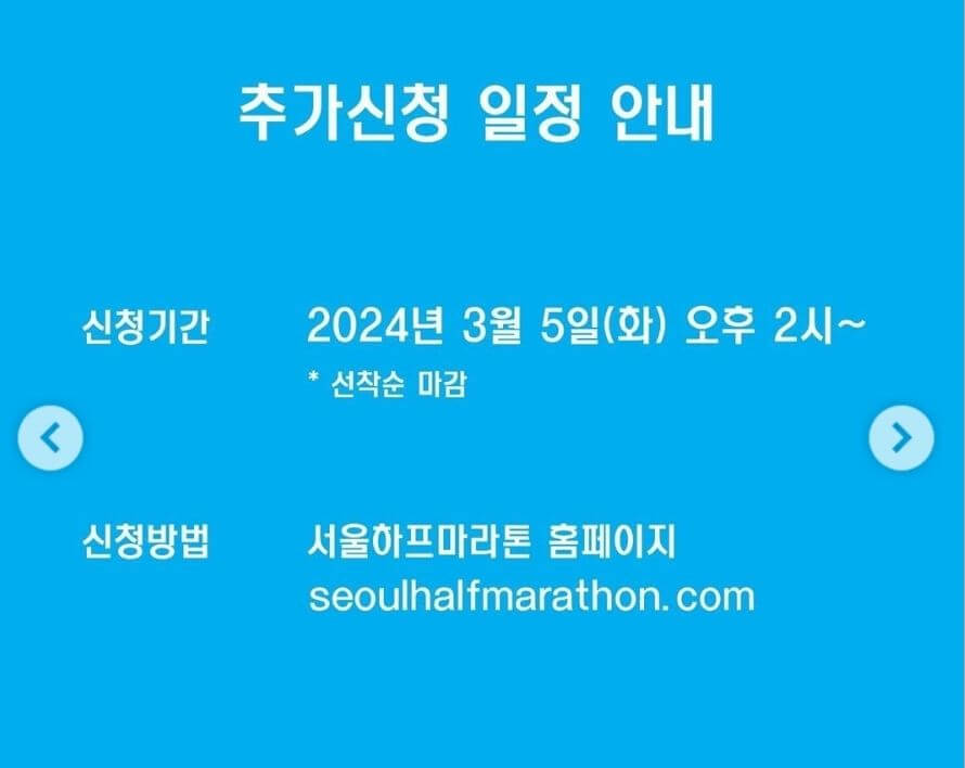 서울 하프마라톤은 이미 전 부문 신청이 마감되었습니다. 그러나 추가 접수 일정이 발표되어 많은 분들의 관심을 끌고 있는데요, 2024년 3월 5일 (화) 오후 2시부터 추가접수를 받습니다. 선착순 접수이니 홈페이지에서 미리 대기하셨다가 바로 접수하시기 바랍니다.