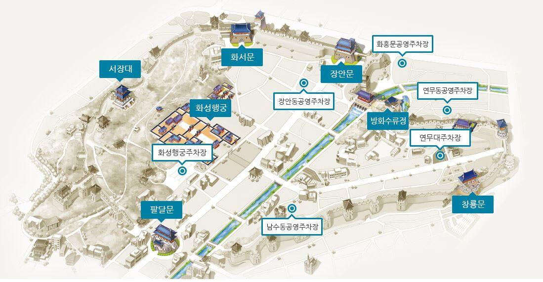 수원화성 화성행궁의 전체 주차장 위치는 아래 지도를 참고하세요.