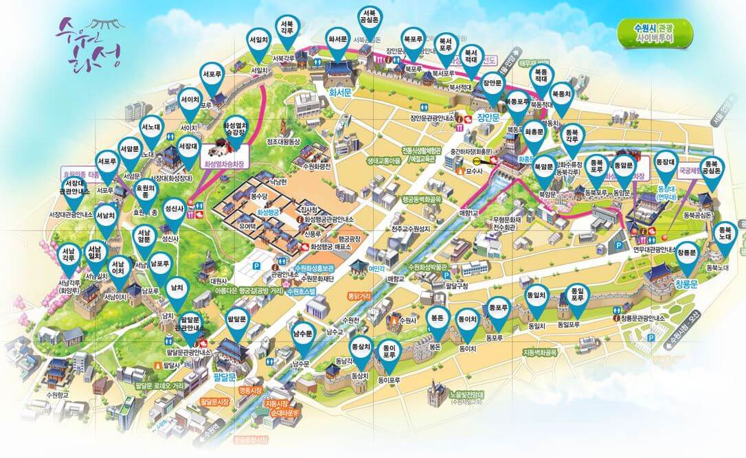 국궁체험을 마치고 바로 수원화성 성곽을 따라 올라가면 창룡문, 동복공심돈, 동장대를 지나 화홍문까지 조선시대 성곽건축기술의 백미인 수원화성을 관람합니다. 걷는 것을 좋아하시는 분들은 장안문까지 걸어도 좋습니다. 오늘 당일치기 여행 지의 정확한 위치는 아래 수원화성 지도를 참고하세요
