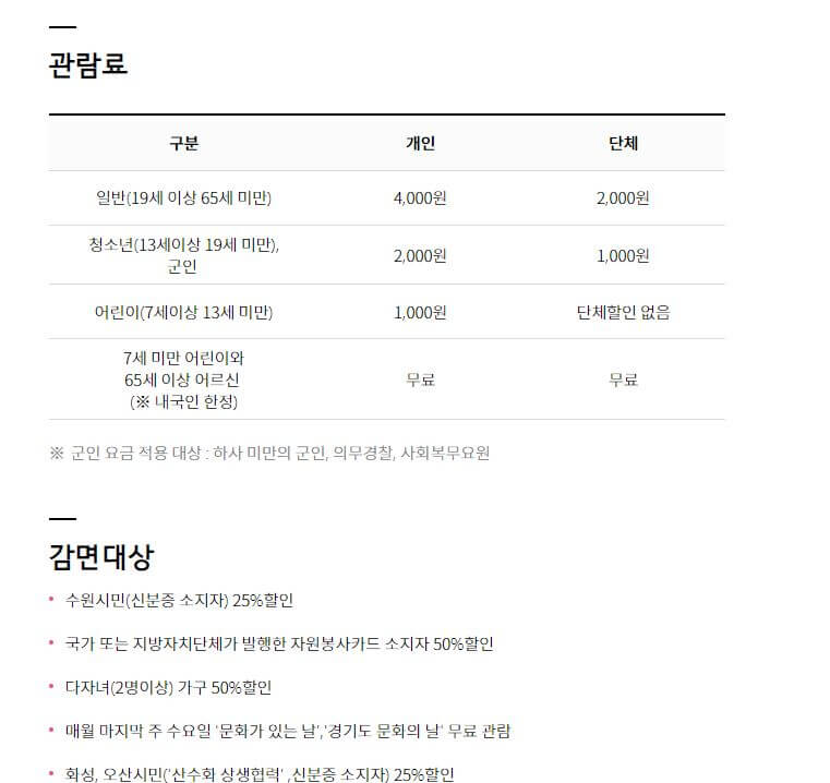 자세한 관람료 및 할인 방법은 아래 표를 참고하세요.