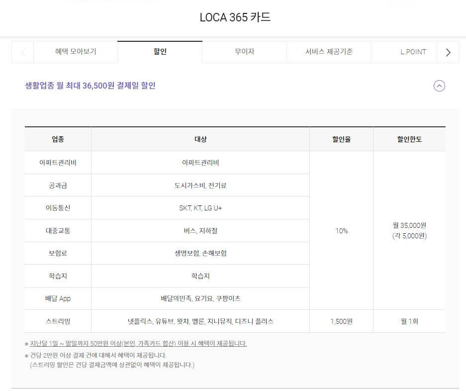 이 카드는 실적에 제외되는 항목이 거의 없는 점이 장점입니다. 1인 가구, 혹은 신혼부부, 2인가구에게 추천하는 카드입니다. 전달 이용금액이 30만 원 이상일 경우에는 혜택이 적용되며, 고정생활비를 줄이는 카드를 찾는다면 LOCA 365 카드와 신한 미스터라이프가 정답입니다.