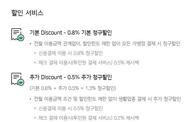 우리 DA@카드의 정석이 인기를 끈 가장 큰 이유는 전월 실적에 상관없이, 한도 제한 없이 0.8% ~ 1.3% 청구 할인 혜택을 주는 것입니다. 카드 소비를 줄이고 조금이라도 아끼고자 하는 분들이 많이 선택하는 카드입니다. 또한 사전 지정한 금액 까지는 체크카드처럼 사용가능하고, 초과 금액은 신용 결제를 제공하는 투인원 기능도 제공하는 카드입니다.