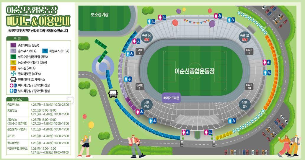 이순신 종합운동장은 축제를 즐기는 메인 무대로 2024.4.26 (금) ~ 4.28(일)까지 다양한 체험프로그램, 축제 개막식과 폐막식 및 군악의장 페스티벌이 주요 행사로 열립니다.