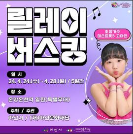 온양온천역 광장에서는 4.24 (수) ~ 4.28 (일) 5일간, 1부 12:00 ~1400, 2부 15:00 ~ 17:00로 나눠 다양한 장르의 음악, 춤, 마술, 퍼포먼스 및 초청가수의 공연이 예정되어 있습니다.