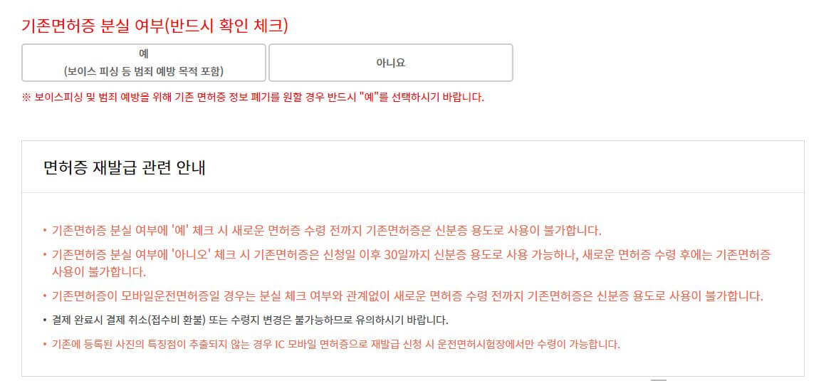 보이스피싱 및 범죄예방을 위해 기존 면허증 정보 폐기를 요청할 수 있으며 원할 경우 약관에서 반드시 "예"를 선택하셔야 합니다.