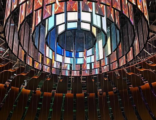 로툰다에는 키네틱 샹들리에가 설치되어 있는데요, 키네틱 샹들리에는 디지털 LED 패널이 계속 변하면서 미디어 아트쇼를 통한 다양한 분위기를 만들어 줍니다.