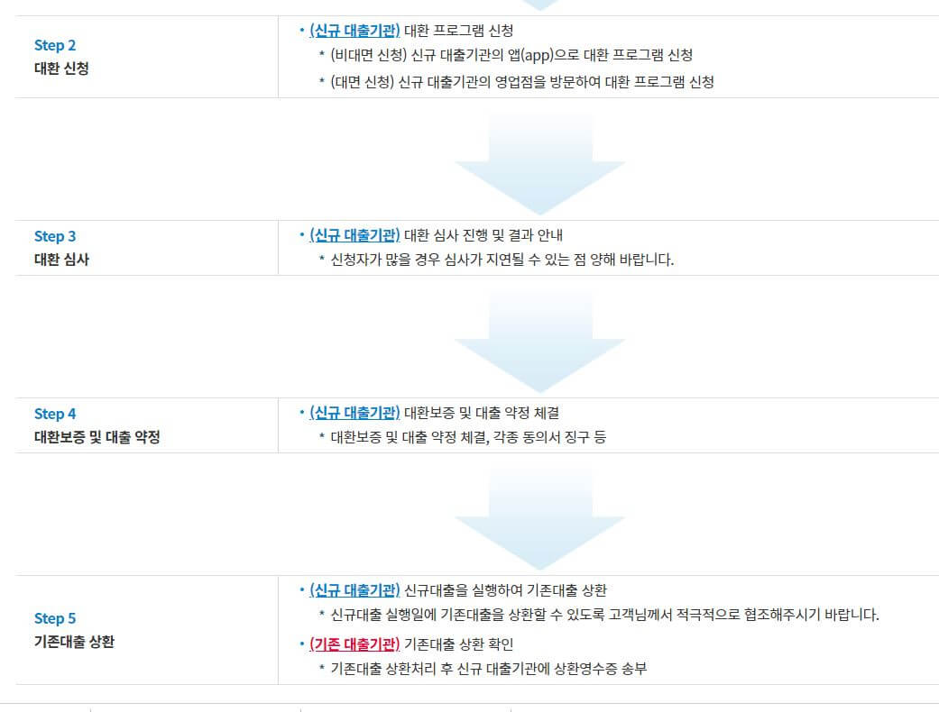 대환 신청 > 대환 심사 > 대환보증 및 대출 약정 > 기존대출 상환의 순서로 진행됩니다.