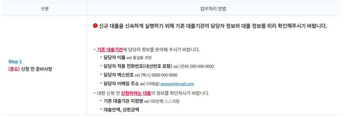 - 기존 대출기관의 담당자 정보와 상환하려는 대출 정보를 미리 확인하세요.