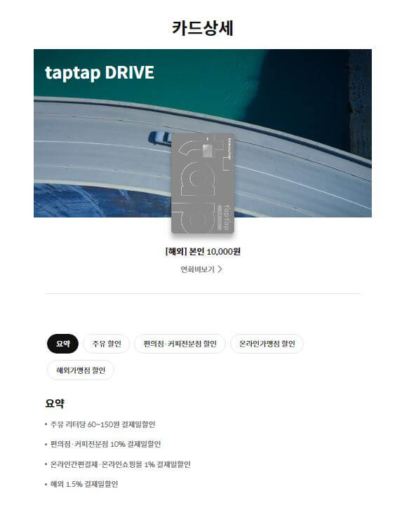 삼성카드 taptap DRIVE 카드는 리터당 최대 150원 결제일 할인이 되며 연회비도 1만 원으로 가성비가 좋습니다. 단, 전월 이용금액 30만 원 이상이며 90만 원 이상 이용 시 150원 할인이 적용됩니다,