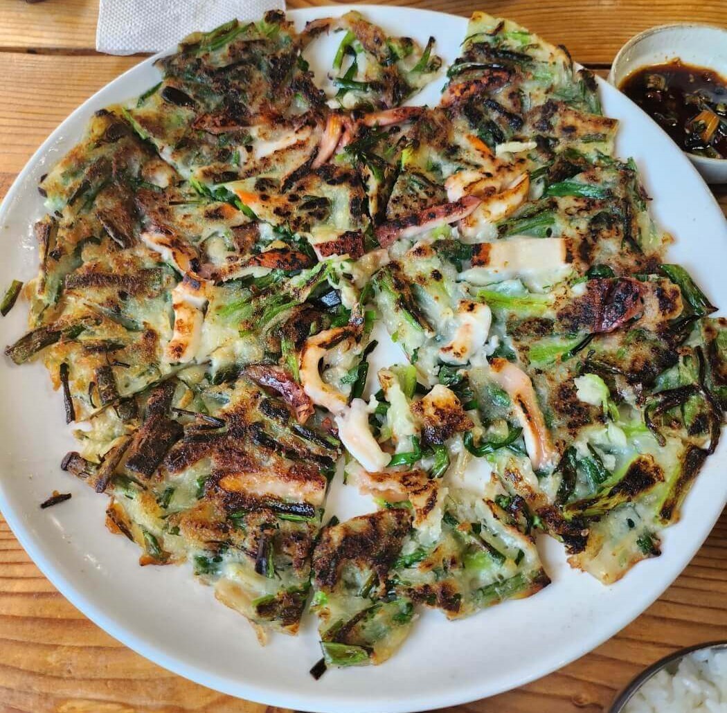진천농다리 구경을 마치고 주차장 초입에 있는 농다리 천년사랑에서 해물파전과 청국장을 주문했습니다. 밑반찬도 맛있고 해물파전과 청국장도 아주 맛있게 먹었습니다.