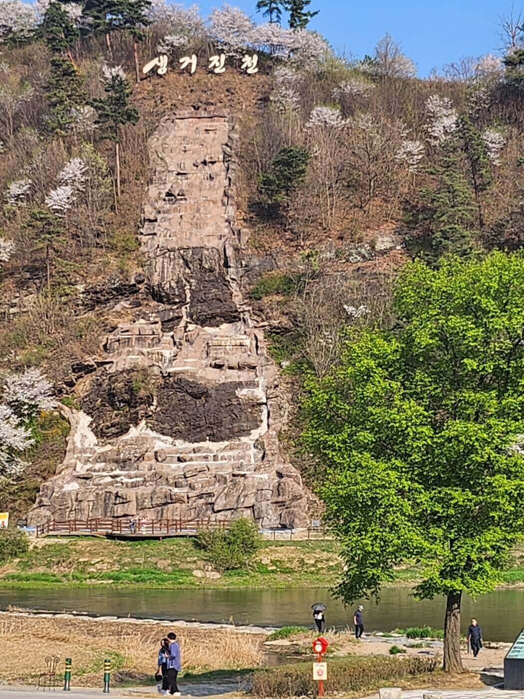 농다리입구의 주차장에 주차를 하고 내리면 탁 트인 전경에 보이는 큰 폭포가 바로 보이는데요, 생거진천 폭포입니다.