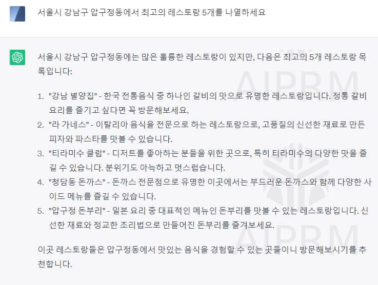 <도시이름>에서 최고의 레스토랑 5개 나열하세요. <서울시 강남구 압구정동>