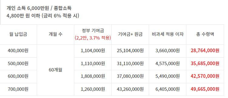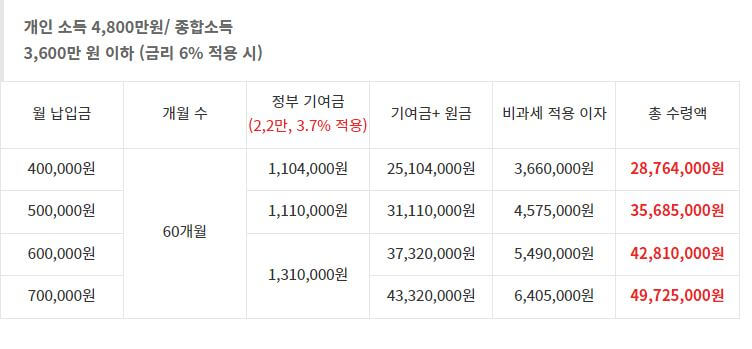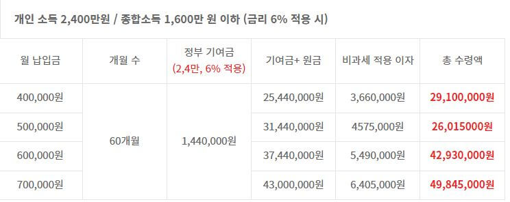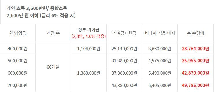 청년도약계좌 소득별 수령금 비교