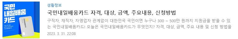 | 국민내일배움카드 자격, 대상, 금액, 주요내용, 신청방법 (0) | 2023.03.31 |