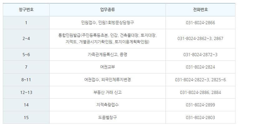 - 여권접수, 외국인체류지변경: 031-8024-2822~3, 2825~6