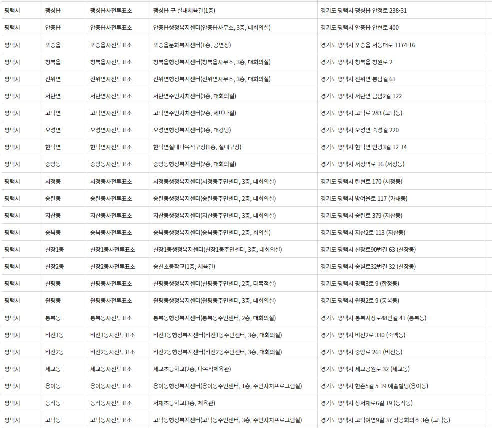 평택시의 사전투표소는 평택시 25개 읍 면 동에 모두 설치됩니다. 평택시 사전투표소의 위치와 주소는 아래 표를 참고하세요.