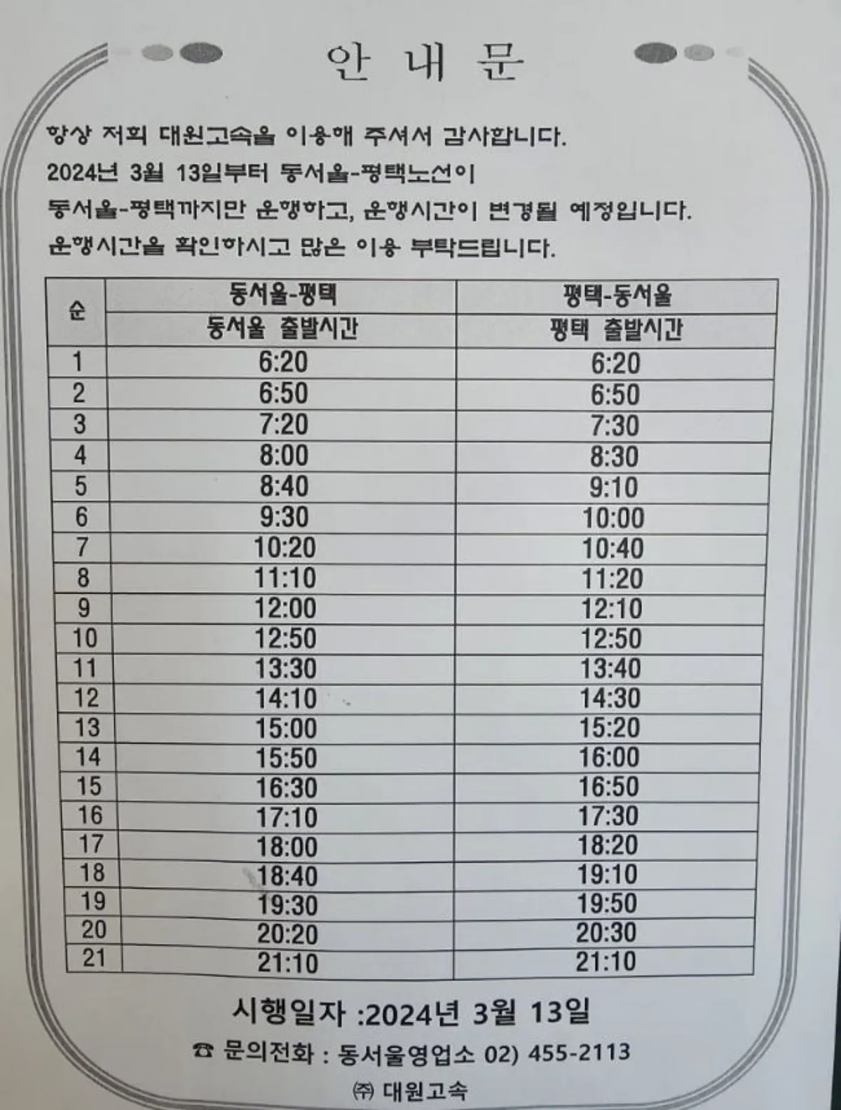 - 문의처: 대원고속 동서울 영업소, 02-455-2113