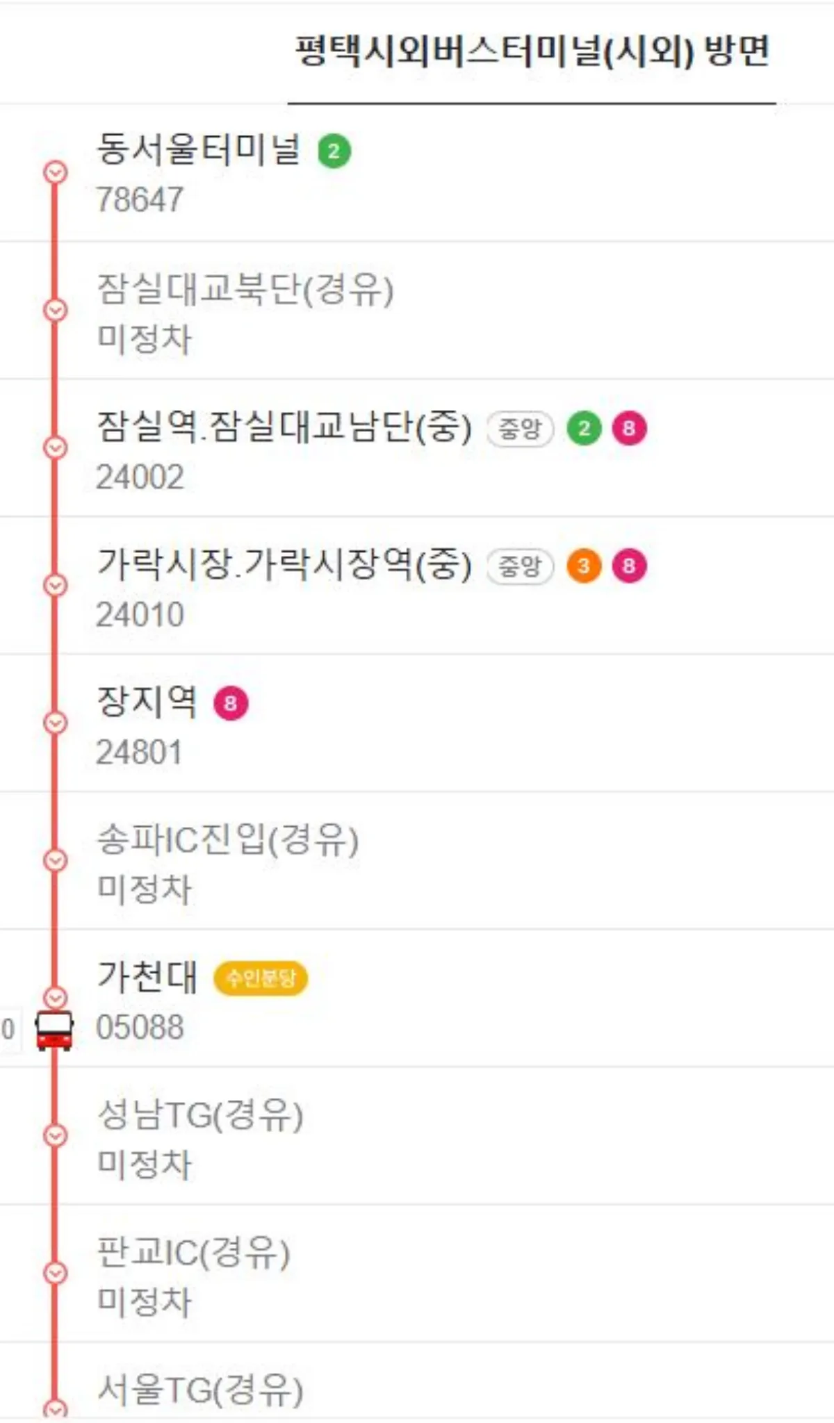 - 기점 (동서울 터미널):첫차 06:20, 막차 21:10