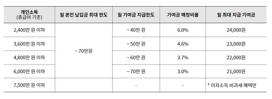 - 소득에 따라 최소 월 40만 원에서 최대 70만 원까지 납입가능하며, 정부가 3~6%의 지원금을 매칭시켜 줍니다.