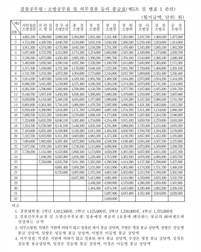 2024년 경찰공무원 소방공무원 의경 봉급표