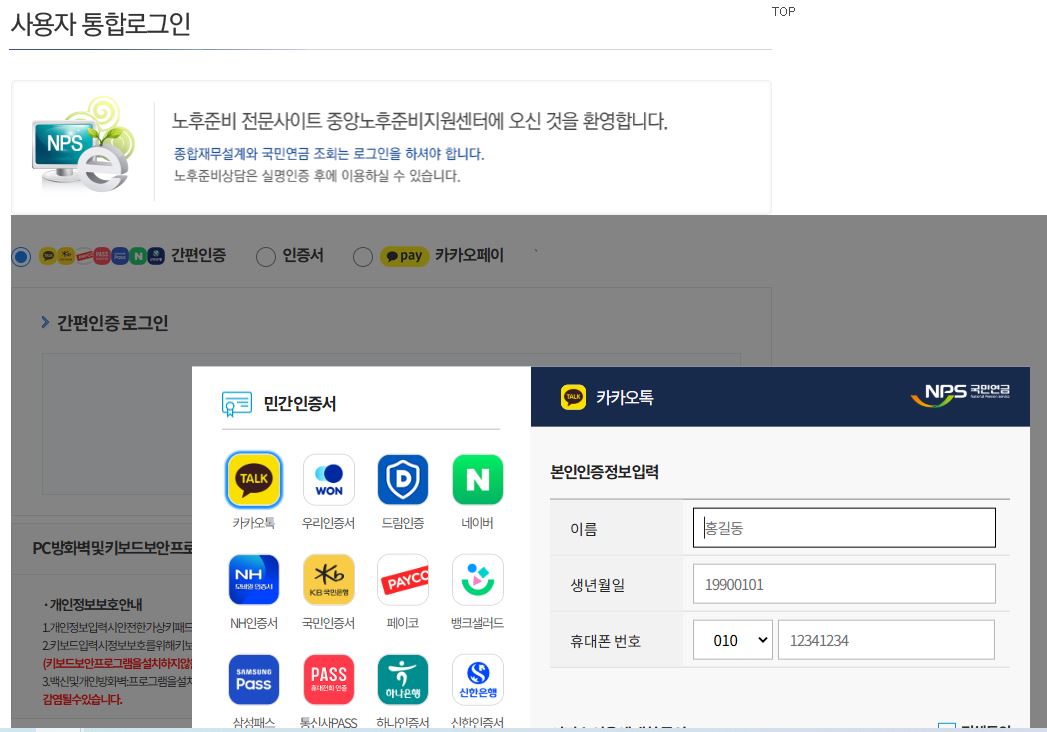 간편 인증 로그인 화면이 나오면 카톡이나 본인이 사용하는 간편 인증으로 로그인합니다.