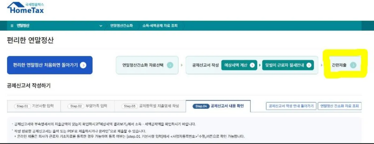 공제신고서의 내용을 모두 확인 후 화면 맨 우측의 간편 제출을 누르면 연말정산 신고가 완료됩니다.