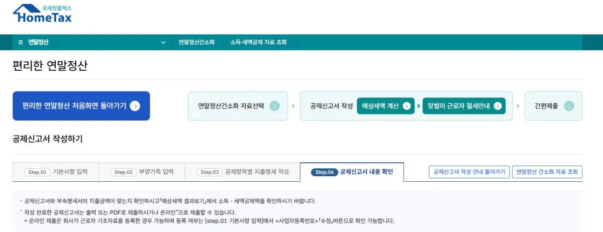 - 기본사항 입력 > 부양가족 입력 > 공제항목별 지출명세 작성 > 공제신고서 내용 확인