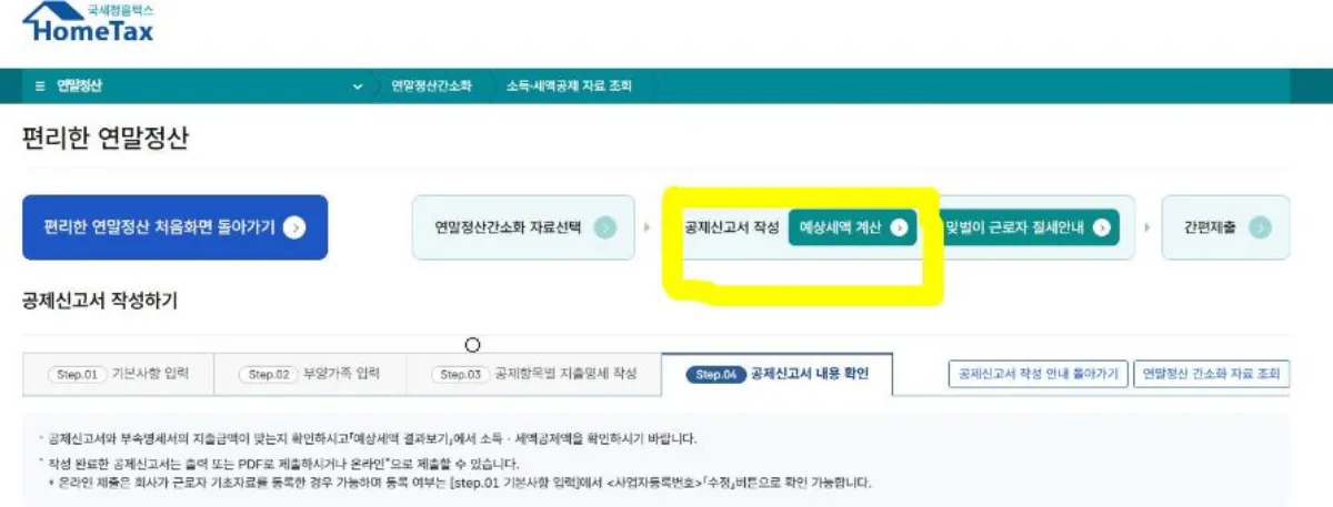 연말정산 예상 환급금 조회는 두 가지 방법으로 할 수 있습니다 먼저 공제신고서 작성 단계에서 "예상세액 계산" 버튼을 누르면 예상 환급금을 조회할 수 있습니다.