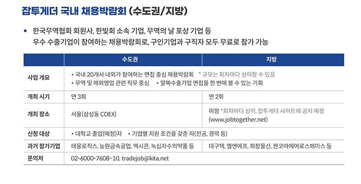 잡투게더 채용박람회는 수도권은 연 3회, 지방은 연 2회 실시하며, 자세한 정보는 아래에서 확인하세요!